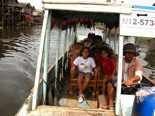 Half the adventure was getting there. We started out by tuk tuk. The tuk tuks here are just a motorcycle with a wagon attached to the back. It was quite a comfortable ride and we enjoyed the sights along the way. Initially we saw the city streets and the people working in shops etc, but soon we got into the country and it was a bit of a shock to see the poverty and lack of what we consider the basics. No electricity, no running water, grass huts, and barefoot children. Although the government-run schools are free, many Cambodians don't send their children because they can't afford the books and uniforms.